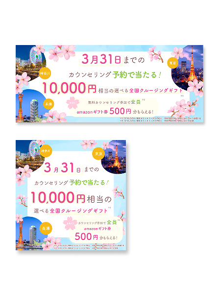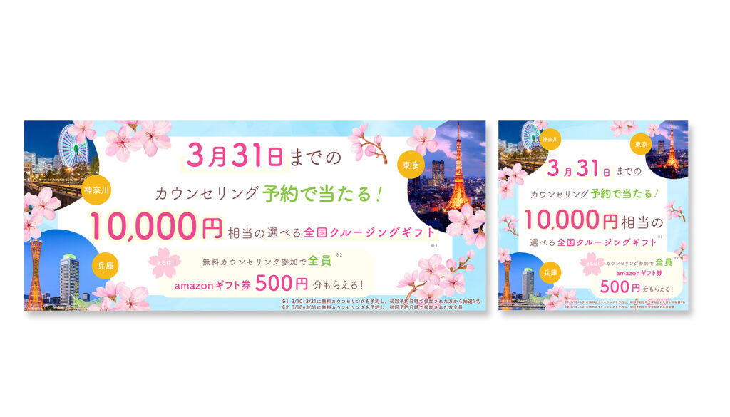 バナー作成 2025年7月4日 最終更新日時 : 2025年7月4日 riko_portfolio 【製作時間】3時間/1枚【使用ソフト】Photoshop・illustrator【担当業務】デザイン【意識した亊】春らしい季節感が伝わるデザインにしました。